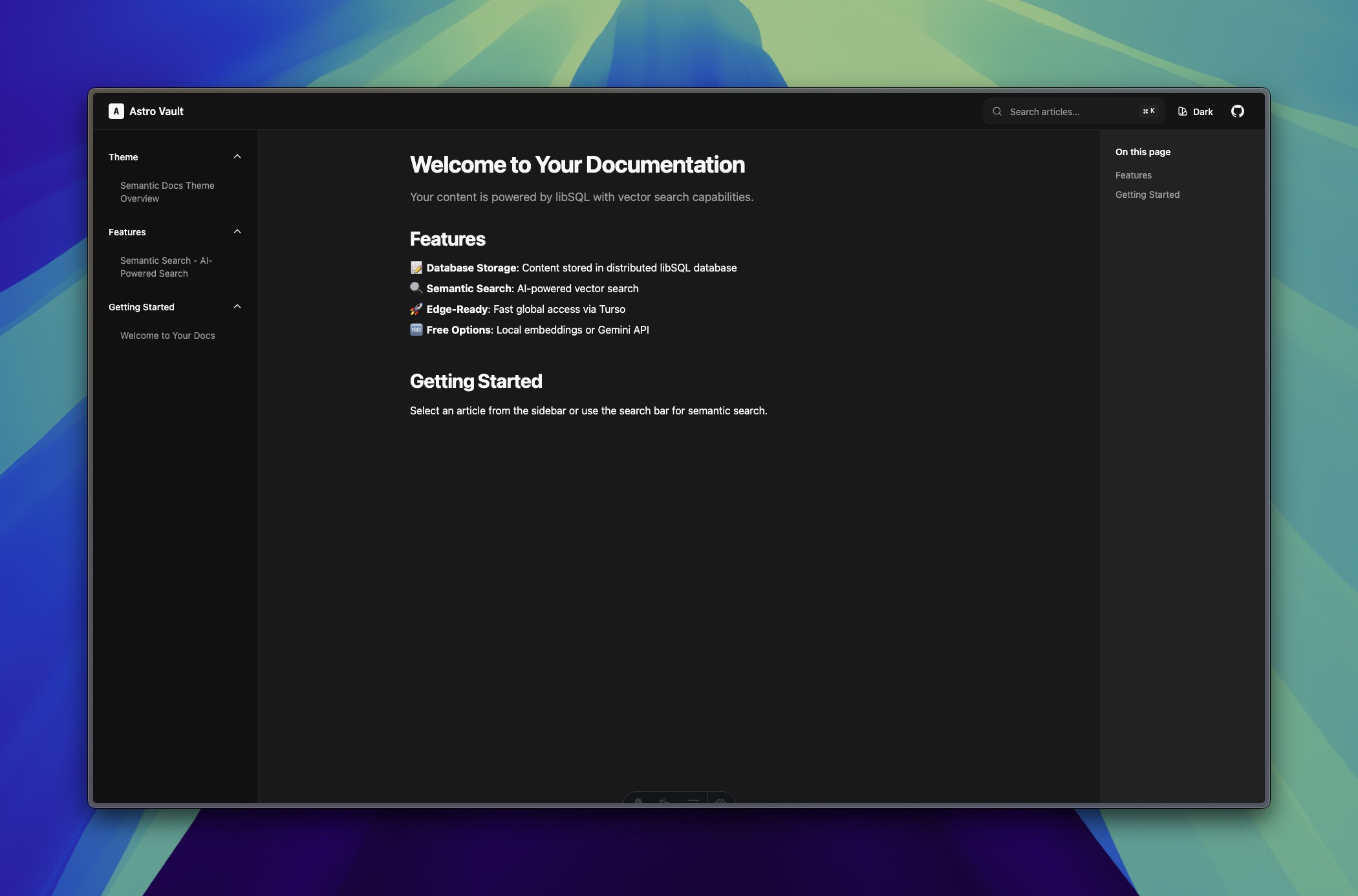 A documentation theme with AI-powered semantic search using libsql and Turso. Features static generation, edge-optimized vector search, 6 built-in themes, and automatic TOC generation.