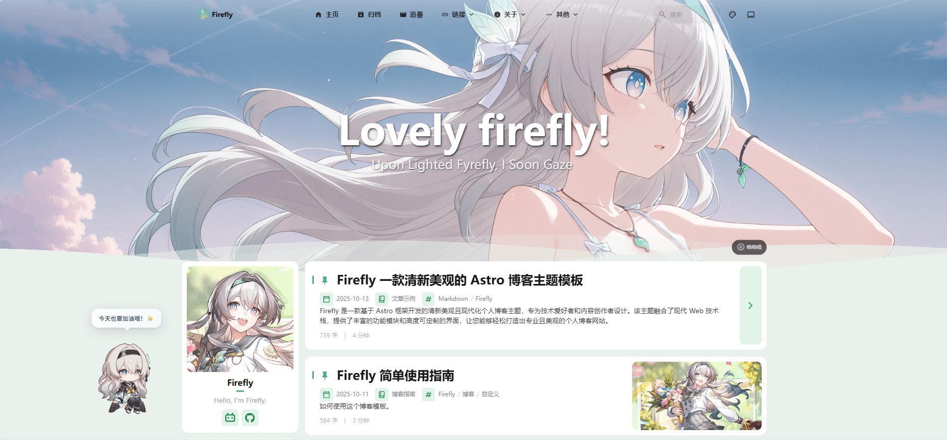 Firefly is a fresh and visually appealing Astro blog theme template, featuring the lovely Firefly from Honkai: Star Rail as its mascot!
