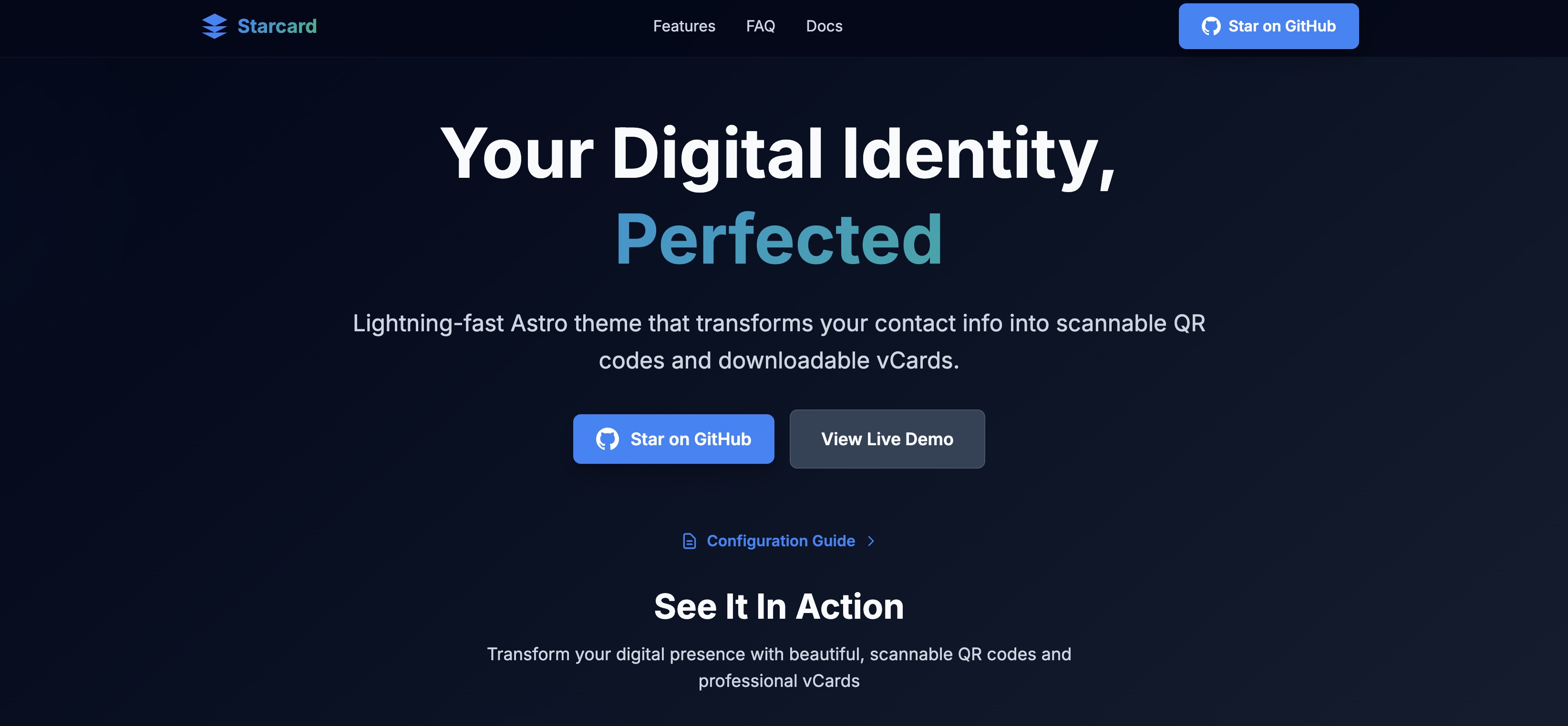 StarCV (Starcard) is a sleek Astro-powered theme that turns your contact data into scannable QR codes and downloadable vCards — perfect for sharing your digital identity instantly across devices.